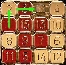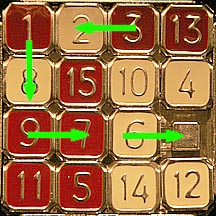 At first this would appear to be an impossible situation because tiles are at opposite ends of where they are supposed to be and because there is so little maneuvering room. The solution is to employ the same trick we used to get the 4 and 8 into their spots: create an empty space near the target tile by temporarily moving other tiles "in order" out of the way. Some times at this late stage of solving a 15 puzzle the exact same technique can be used to finish it off. In this particular case things are a little more complicated so we have to modify the process a little.