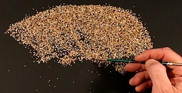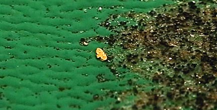 The water washes away light blonde sands and heavier black sands. Wearing the 5X glasses, search for specks of yellow near where you placed the sample. It usually doesn't travel far because it's too heavy for the water to wash away. Larger pieces can be picked up with the tweezers. Smaller pieces have to be sucked up with the snuffer bottle. One way to speed up the separating process is to repeatedly tap the side of the table. These vibrations shake the table's surface and make the black sands wash away faster but don't affect the gold as much.