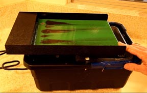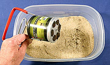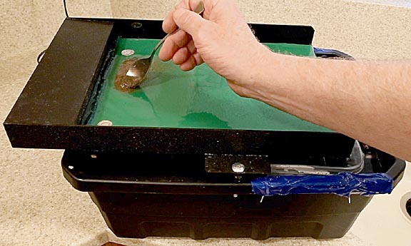 After the water is clear, pour off most of it so all you're left with is a layer of wet sand in the bottom of the bowl. Set up your Miller table, if that's the route you've chosen being sure to add one teaspoon of Jet Dry for a four gallon size reservoir, and one tablespoon at a time spread it along the top edge of the table.