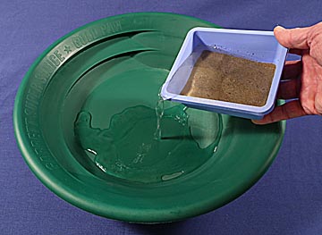 Once I've convinced myself I've found all the pickers in the #4 to #30 mesh screenings, one size at a time I place each size screenings into the wash bowl, add a drop of Jet Dry, add water, stir, then pour the water off taking away the silt and mud. Pour slowly so none of the heavy material in the bottom of the pan is lost. Repeat until all the mud is washed away. This step prevents the processing water from getting dirty.