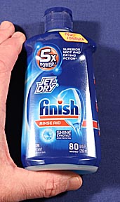 10. A bottle of Jet Dry. This is used in automatic dishwashers to prevent water spots forming on dishes during the drying process. It's purpose it to reduce the surface tension of the water so that fine gold particles don't float away. Gold is hydrophobic, repels water, so this can be a problem. Dish soap can be used but Jet Dry works just as well and doesn't foam up.