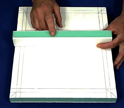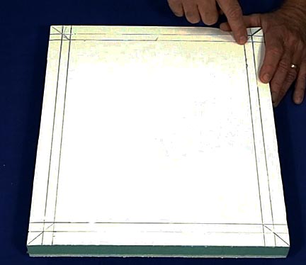 Next we measured the dimensions of the panel and added one half inch all the way around for the inner border and three quarters of an inch all the way around for the outer border. Drawing rectangles corresponding to these lines defined the size of the board, which was then cut out.