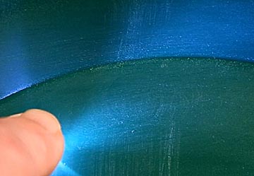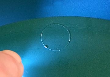 Both of my Garrett Super Sluice gold pans came with three, one inch diameter raised circles with sharp molding ridges around them. These were created during the injection molding process. Because they block the smooth flow of material over the surface of the pan, gold and black sand get hung up in them. Starting with 120-grit sand paper and a sanding block, I sanded the ridges and raised circle down until the surface was flat, then smoothed it with increasing grits until I got to 1000 grit.