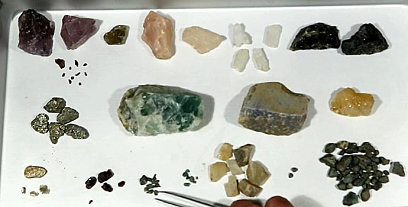The image above is a small sample of what they found. Starting in the upper left corner: amethyst (purple quartz,) smokey quartz, rose quartz, clear quartz, quartz crystals, obsidian, iron pyrite (fool's gold,) a transparent sea-green crystal we couldn't identify, blue apetite, citron, mica, garnets, ruby (one small reddish-brown pebble that glowed pink under a black light, which is a sure test for ruby,) a dozen small green crystals we assumed were emeralds, pale blue aquamarine, and calcite... just to name a few. None of these are gem grade stones, but that didn't stop the kids from having a ball finding them.