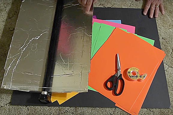 All that's needed are some sheets of black poster board, a collection of day-glow colored poster boards, double faced tape, scissors and a black light. The last item is available at Walmart for as little as $11.00.