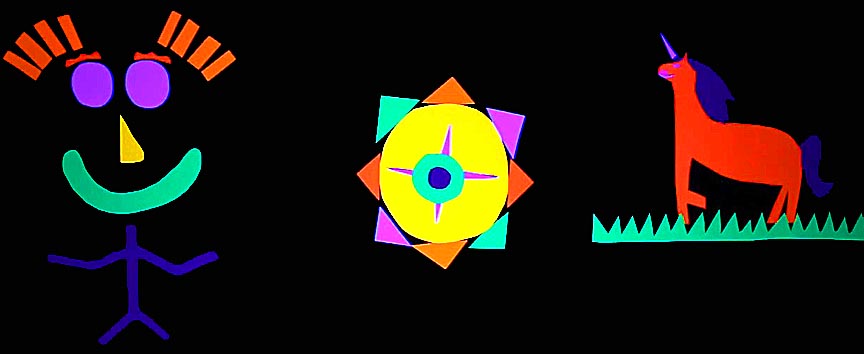 Have the children cut shapes out of the neon colored poster board and use the tape to stick them to the black poster board. Once they are done, move to a dark room and shine the black light on the pictures and they will appear to glow with a wonderful brightness. The reason is that the dyes in day-glow, or neon, poster board contain fluorescent materials that glow when excited by the ultraviolet light from the black light.