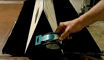 Using a 4-foot piece of wood covered with black cloth provides a dark edge that enhances the image and holds the bottoms of the mirrors in place while still allowing them to be moved to create various mirror angles. Use packing tape to hold the top edges together.
