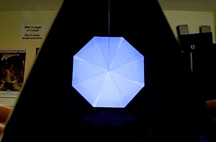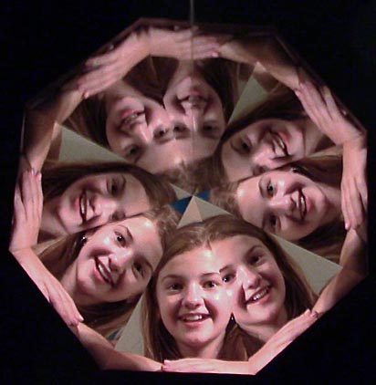 For safety, I recommend covering the exposed end edges of the mirrors with some clear tape. This won't interfere with the image very much and will prevent anyone getting cut if they brush against the sharp glass. To watch a live action version of this page and see this giant kaleidoscope in action, please click on the following YouTube link: