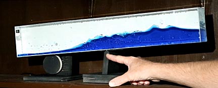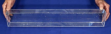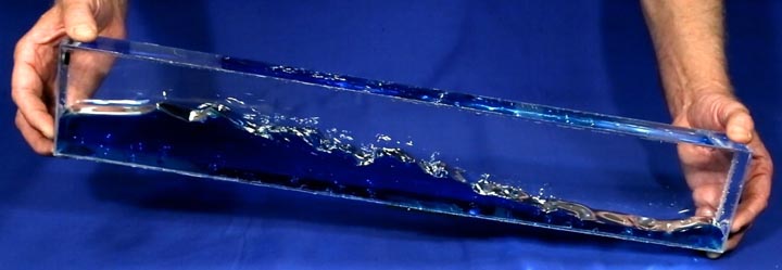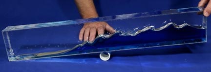 The classic wave motion machine or cell is a clear container with a layer of colored water covered with clear oil. While any container works, long rectangular vessels provide the best wave action.