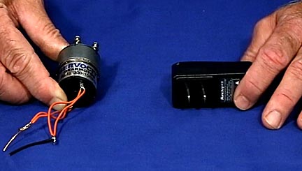 The waves in this 24 inch long cell flow back and forth at a rate of 10 cycles per minute. Therefore a motor with a speed of 10 RPM is ideal. The one pictured below is a 12 volt DC gear motor that can be run off of a battery pack or in this case, an old 12 VDC power plug. Such motors can be purchased from Amazon or ServoCity.com for anything from $12 to $25 depending on the model selected.