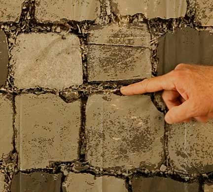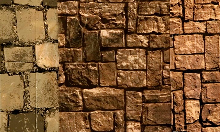 The cobblestone pattern had horizontal mortar joints that made hiding seams easy. I cut along one of these joints on the bottom of the upper piece and then overlaid it on the piece used for the bottom half until the cut edge was hidden in a joint on the lower half. The irregularity of the joint made it difficult to spot the seam.