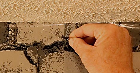 Hang the pieces in 9-foot long sections. Longer sections are difficult to control. When overlaying the previous section with the next section, move the new section left and right to get the cobblestone patterns to match as much as possible. The last pins used to hold up the first section should be flat thumbtacks instead of the black push pins because they won't create a bump in the overlaying cloth.
