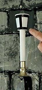 These looked okay, but the bare bulbs were far to harsh. I solved this by cutting a hole in the bottom of a 3 ounce plastic cup and screwing the bulb through the hole and into the base. Strips of black duck tape created a wrought iron look that worked very well. Ten, 40-watt equivalent LED bulbs illuminated the room bright enough to have a meal but slightly dimmer than normal room lighting, which helped enhance the medieval room theme. To hide the wires, cut an opening in the cover and slide the wires down behind the covering.