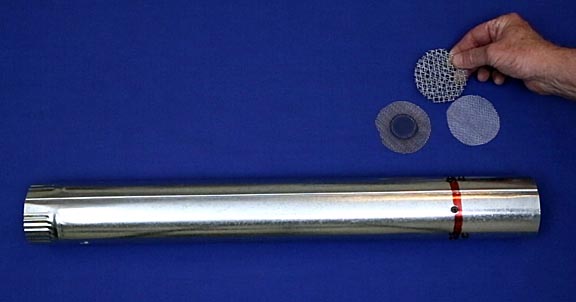 Cut three screen disks that fit snuggly into the tube. Twenty mesh stainless steel screen ($2 to $3 per 12 x 8-inch sheet from Amazon.com) works best. A good pair of tin snips will be needed to cut it. Aluminum window screen (lower right) can be used, but doesn't hold enough heat to maintain the tone very long and the center burns up after just a few uses. Hardware cloth (above, center) is hard to cut and lets so much air flow through it that it doesn't work well.
