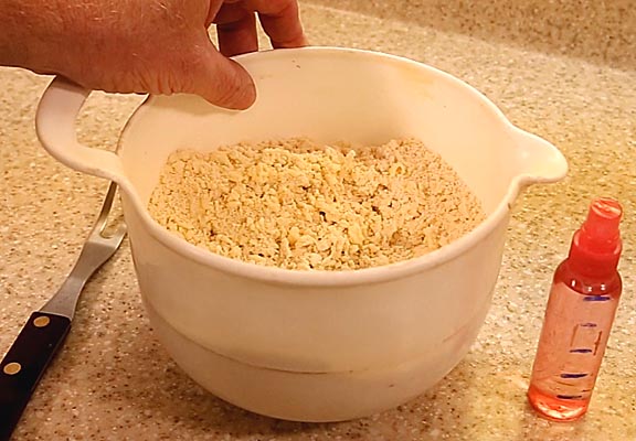 To help create a uniformly moistened dough, use a spritzer to slowly add water to the dry mix, stirring with a two pronged fork after every ten to twenty spritzes. Since Crisco doesn't have any water in it, more water is required than in butter based recipes because it's 17 to 20 percent water. Seven to nine tablespoons of water are usually needed for my recipe.