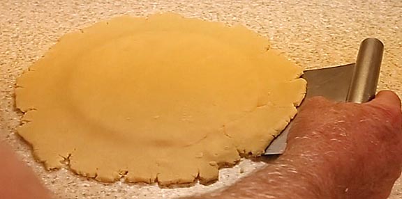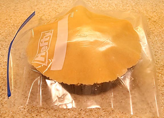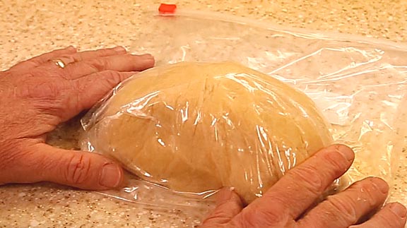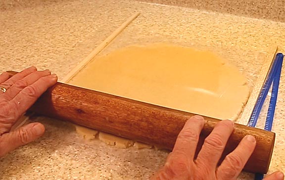 Form the rested dough into a brick and cut off one third. This will form the top crust. The larger portion is for the bottom crust. Roll it out between two sheets of plastic. I like using a two gallon plastic bag slit up the sides. Three-eighth inch thick rolling guides will ensure your dough comes out even.