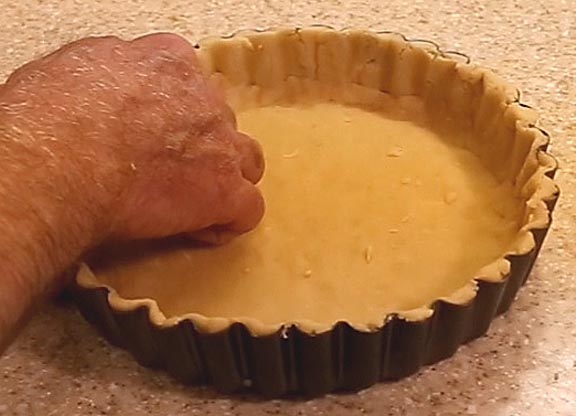 Using a pushing action, lift the sides of the dough and push them into the sides of the tart pan. level off the top and use any scraps to strengthen the corner of the pie. This ensures that nothing with leak out during baking.