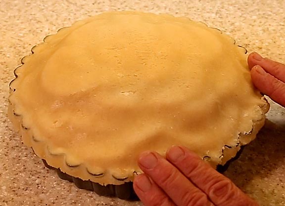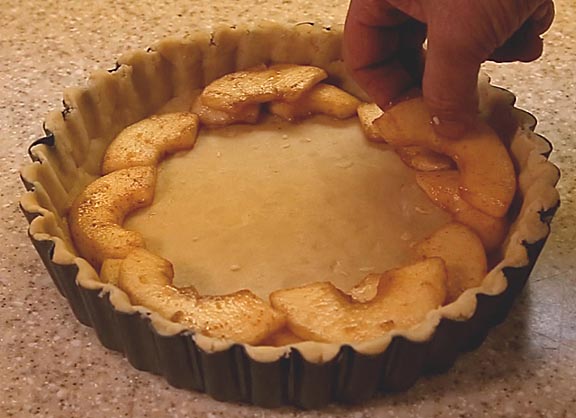 I suggest using a tart pan for baking apple pies because it makes depanning very easy. For a recipe using four pounds of apple slices, a nine inch diamter pan with two inch high sides works well. Center to tart pan's bottom on the larger piece of rolled out dough, flip it over using the plastic for support, peel the plastic off and gently fold the edges of the dough over so the bottom will fit into the tart pan's outer ring.