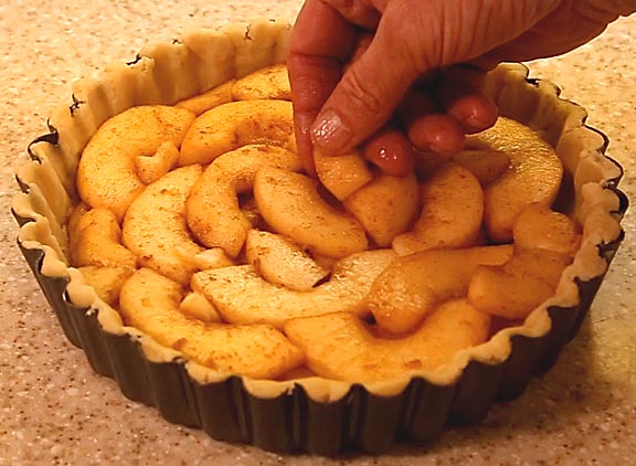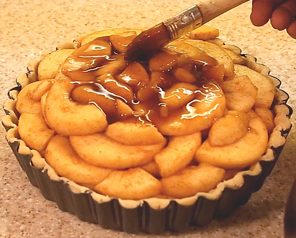 While making the pie dough, the apples may have given up some more apple juice. If so, reduce it as before, combine it with the first reduction and spread it over the top of the apples.