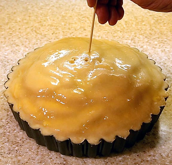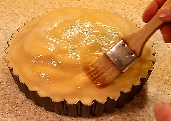 Paint the top with a little egg wash to create a shiny glaze. Be careful to stay away from the edges or you may glue the crust to the tart pan. You make sprinkle some large grained sugar on the pie at this time if you like.