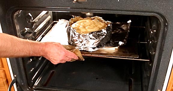 Move the pie up to a middle rack and finish baking for another 25 minutes. Placing a ring of foil around the edge will prevent it from burning. How long the pie bakes is determined by how firm you like your apples to be. Baked to an internal temperature of 165 degrees leaves the apples slightly firm, 175 yields soft baked apples and 185 gives you something close to applesauce.