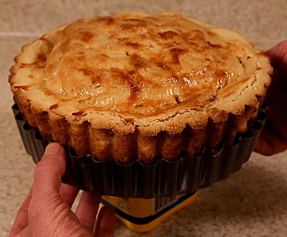 Remove the pie and let it cool on a rack for one hour. Place a stable support under it to hold the middle and slowly pull down on the side of the pan. It should come away cleanly.