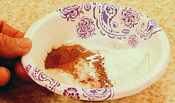 Combine 50 more grams of sugar, two too three tablespoons of cornstarch (depending on how thick you like to pie juices to be thickened) 3/8ths teaspoon of salt and one teaspoon of cinnamon. I prefer my apple pies to taste like apples so all I add is enough cinnamon to brighten the flavor a little. But by all means, use whatever spices and flavorings you like. Mix with a small whisk. Blending sugar into the cornstarch helps break it up and prevents clumping.