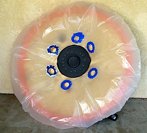 Turn the base over and secure the center with a smooth edged piece of plastic or wood. This holds the middle of the plastic to the underside of the base so a pocket is created to allow the air to escape. Cut six holes in the plastic close to the center and strengthen them with duct tape so they don't stretch out.