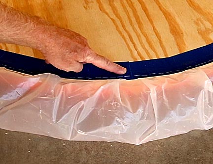 Put down a layer of indoor/outdoor double faced carpet tape around the upper perimeter. Bring the edge of the plastic up and stick it to the carpet tape. Work your way around the perimeter making sure to make the gathers, the overlapping sections of plastic, as even as possible. Cover the edge of the plastic with duck tape to seal it to the base. Make sure the tape is carefully burnished down to seal it as tightly as possible. Finally, drive a line of staples all the way around the edge to secure the plastic skirt in place. While I used 6 mil polyethylene and it worked well, using a thicker material like a heavy duty shower curtain will make the skirt more durable.