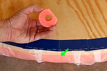 Before putting the balloon skirt on the hovercraft, I took some 3-inch diameter foam swimming straws, cut one side flat and glued them to the lower edge of the base. My thought was that this would create a skirt that was much simpler to make than a balloon skirt. It didn't work. On very smooth surfaces it would just barely support a 50-pound child with the motor running flat out. Even then it was hard to push. This was an idea that failed. Rather than take it off, I simply mounted the balloon skirt over it. The swimming straw skirt can be seen under it (green arrow.)