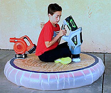 3. The 18-volt blower mounted on the back of this hovercraft was woefully underpowered to push the car around. It only produced 1 ounce of thrust while I measured the required thrust to move the car at around one pound. This little blower couldn't even keep it from sliding downhill. I figure I'd need a second E-Go blower for propulsion. It turns out a pusher isn't needed. As a family activity, shoving the rider around by hand is almost as much fun as riding the hover car.
