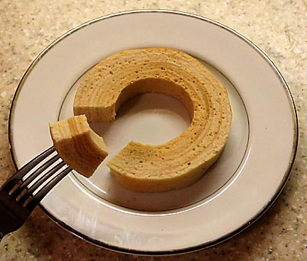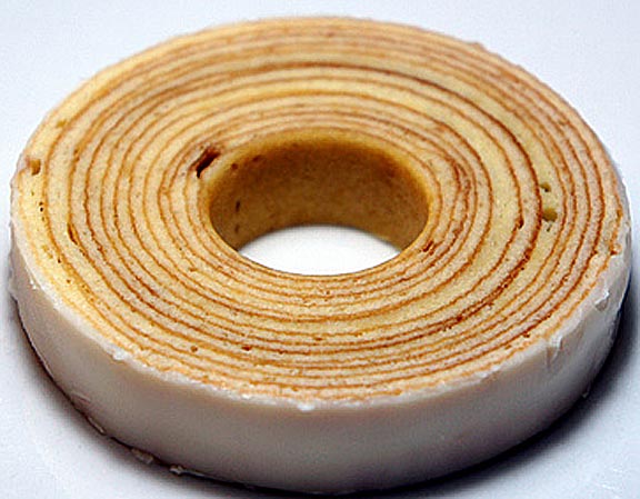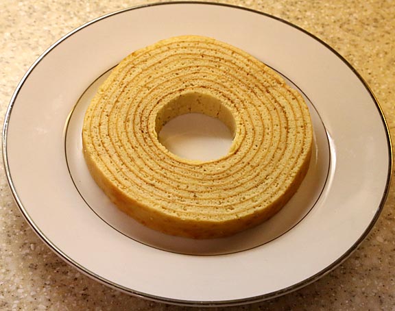 Baumkuchen, translated as tree cake, is a many-layered sponge cake baked on a rotating cylinder. As the cylinder rotates, it's coated with a thin layer of batter, allowed to bake to a light golden brown, recoated, baked again and so on until 20 or more layers are created. After cooling, it's cut off the cylinder in donut-shaped discs. When viewed from the top, the many layers look like the growth rings in a tree, hence the name. (And regarding of its name, it is incorrect to speak of Baumkuchen cake because the word Baumkuchen literally means tree cake. The "cake" noun is already present. Saying "Baumkuchen cake" is the same as saying "angel food cake cake.")