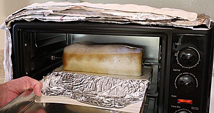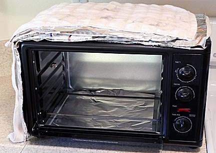 First, I filled the 1-inch gap between the inside top of the oven and the outside top with alternating layers of cake racks and aluminum foil. This created a double thermal radiation barrier, which greatly reduced the loss of heat through the top of the oven.