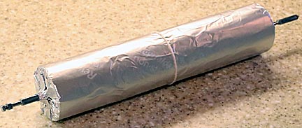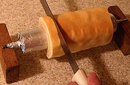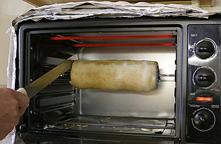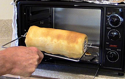Prior to baking, the cylinder is wrapped in non-stick aluminum foil with a length of string tied around the middle to keep the foil in place. Crimping the ends of the foil around the rotisserie rod keeps the cylinder centered.