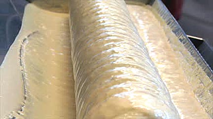 If made with that same amount of liquid as specified in the instructions on the box, the batter is too thick to properly flow onto the cylinder. Increasing the milk from 1 and 1/4 cups to 1 and 3/4 cups thins it out enough to work. Separating the eggs, whipping the whites to firm peaks and folding them into the batter makes the cake more delicate. The resulting Baumkuchen has a much better flavor than the traditional recipe and is lighter. Using mixes also make it easy to try alternate flavors, though darker colored batters won't show the ring structure as well as lighter ones.