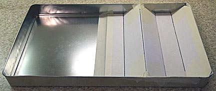 Filing the entire pan with batter would be wasteful so I used cardboard to create a narrow trough for the batter at one end. This section is covered with aluminum foil prior to filling.