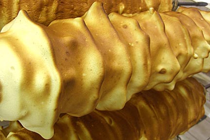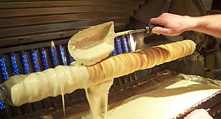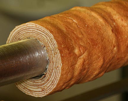 Every baker knows that the best tasting part of any cake is the thin caramelized layer that sticks to the bottom of the pan. Hundreds of years ago, a German baker got the inspired idea of creating a cake whose body was filled with layer upon layer of this richly flavored delicacy. Eventually he or she figured out the only way to do it was on the rotating spit usually used for broiling roasts. The idea caught on and soon bakeries specializing in Baumkuchen sprang up all over Germany. Unfortunately, its very popularity led to people inventing inferior products and labeling them as Baumkuchen. Baked flat-layer-on-layer in conventional cake pans, these torte-like cakes are all that the home baker could produce.