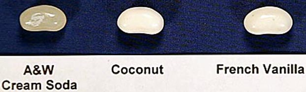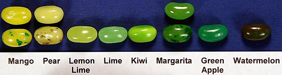 Pear is a drab pale, translucent bean with small dark green flecks. Like the mango, it has a strong, honest pear flavor.