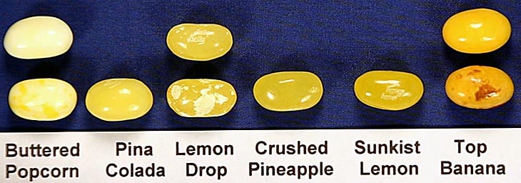 Pina Colada is a light yellow translucent (half way between transparent and opaque) jelly bean with notes of coconut and milk.