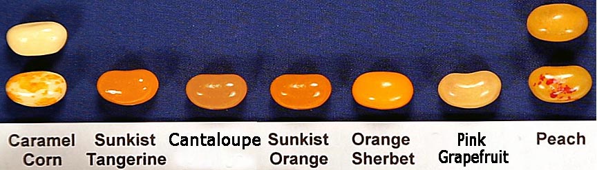 Peach jelly beans are dark orange splashed with red. The ripe peach flavor is strong, pure and absolutely delicious. Sometimes I think it leans a little more toward a nectarine, but either way it's great. Unfortunately it's one of the rarer flavors. This is my overall favorite.