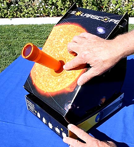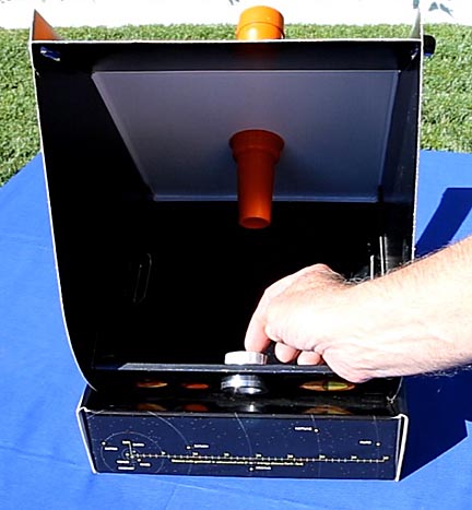 The Solarscope consists of a heavy cardboard fold-together base and telescope body that fit together in an alt-azimuth mount system that is easy to align toward the sun. I found the assembly frustrating because the line drawings in the instructions didn't match the fold lines on the cardboard. In the end, looking at the finished pictures and examining how the cardboard was cut helped more than the instructions. The orange plastic lens holder went together easily, but again the directions and drawings weren't as clear as I'd hoped. The hardest unit to assemble was the aluminum holder/focuser for the tiny convex mirror that projects the sun's image created by the lens onto the viewing surface inside the Solarscope. It was almost impossible when to tell when the mirror was in the correct convex-surface-facing-outward position because of reflections off the shiny aluminum holder. Worse still, there was enough play between the mirror and the holder that it was easy to get it lodged at an angle. Once I managed to get it seated properly, I discovered the black rubber plug used to lock the mirror in place was so hard to push in that I had to use a wood dowel to get it to seat properly against the mirror. The first time I did it I discovered the mirror was crooked. But now the rubber plug was so firmly stuck it couldn't be removed. I ended up having to cut the plug almost in half and then use needle nosed pliers to pull it out so I could start all over. Making matters even worse is that the mirror is very tiny and it's necessary to keep the surface free of fingerprints, both of which make handling it a challenge.
