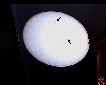 The contrast, brightness and focus have been adjusted in this image to show what you'll see when looking at sunspots through the Solarscope. The upper arrow points to a sun spot about three times the diameter of the Earth. The lower two are each about the same size as the Earth. The disk is very bright so wearing sunglasses is a good idea.