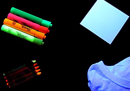 ...are impregnated with dyes that absorb naturally occurring ultraviolet light and re-emit it in intense colors to make the colors appear more brilliant and give whites a brighter, whiter look. When viewed under artificial ultraviolet light sources in a dark room, these fluorescent dyes glow with brilliant intensity.