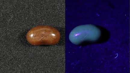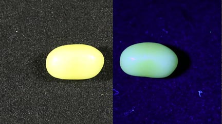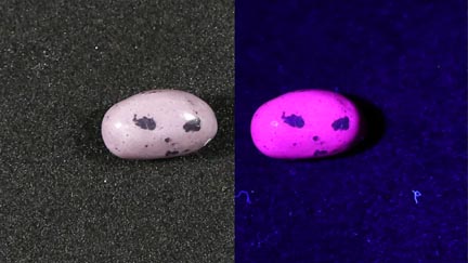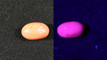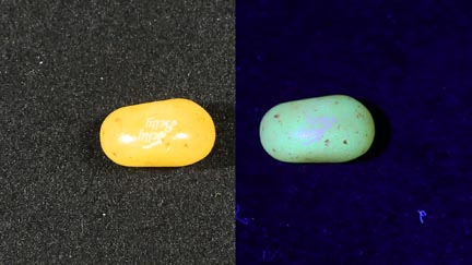 The food industry uses dozens of food grade, edible fluorescent dyes to enhance the colors of their products. The Jelly Belly company uses them in their jelly beans. Additionally, many normal coloring agents also exhibit fluorescent properties. The result is that many Jelly Belly jelly beans look completely different under ultraviolet light than they do under normal light. Here are a few examples: