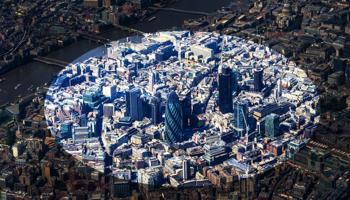 The small red area is "The City" zone of greater London in white.
