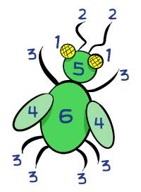 You have to roll the number on the die that corresponds to the number on the body part. The body (a 6) has to be the first part and no eyes or antenna can be drawn until the head is rolled and draw. It's a simple children's game but popular on Beetle drives. The winner can either be the first one done or for longer games, the first one to reach a certain number of points based on the value of each body part and their number. For example, each leg is worth 3 points. There are six legs so if you have all six legs you've earned 18 points from them plus the 6 points for the body for a total of 24 points. A completed beetle is worth 43 points.