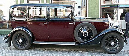 The model 20/25 was one of Rolls Royce's most popular models and remained in production from 1929 to 1936. Audrey's was a 1934 with the license plate BMG 443. This car has been featured in British TV productions for decades and was a regular character in the series. Although the side panels were painted black in the series, they are usually dark red as shown above. Richard snidely comments that it only gets 10 mpg. Actually, 20/25s average closer to 14, better than the 11 mpg his 1979 Rolls Royce Corniche gets in town.
