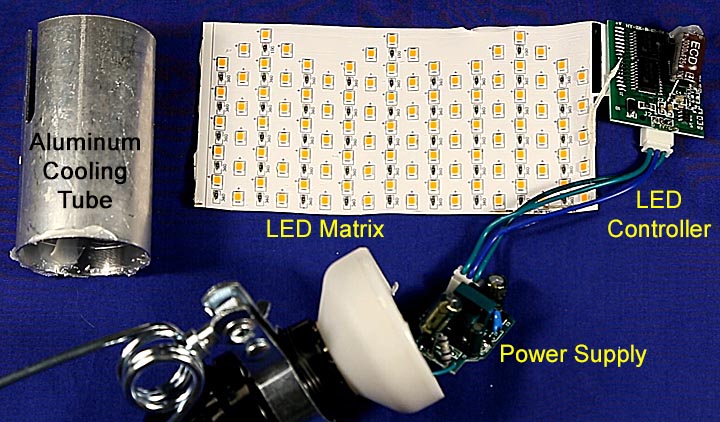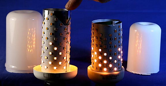 Power comes in through the screw base and passes through a power supply that converts 120 VAC line power to the lower voltage DC power the LEDs require. The LED controller fires the LEDs in patterns that simulate the rising flames of a fire to produce a flame-like effect. Some LED flame effect bulbs are advertised as having millions of patterns to prevent obvious repetitions of flames. But, all of the six brands I've tested appear to follow patterns that repeat every few seconds.