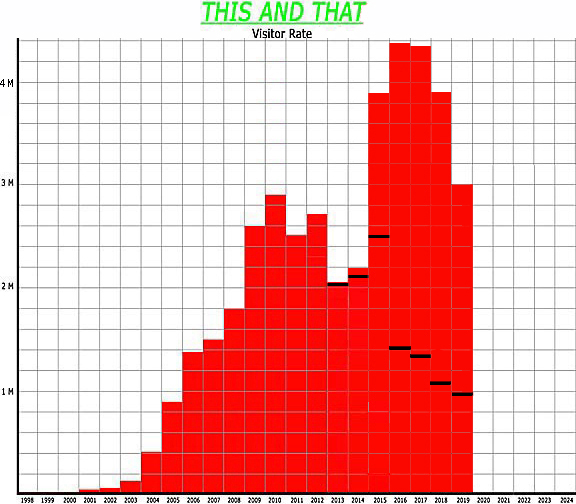 The decreases from 2011 to 2013 are the result of Google changing its rankings systems in an effort to limit content farms. Unfortunately, one of the unexpected side effects of Google's new algorithym was lower rankings for content-rich, non-commercial sites like THIS AND THAT. The massive increase in YouTube views in 2015 was half the result of one of the video's going mini-viral. In 21 days it was viewed over 1,000,000 times. Without this the 2015 total would have been closer to 767,000 views and the combined website and YouTube view total would have been 3,231,709.