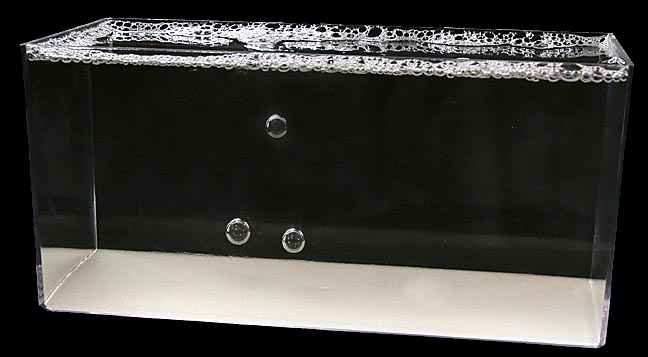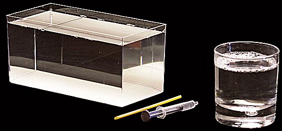 My antibubble system uses a clear plastic box with six cups of water, half a cup of clear dish soap mixed in and half a cup of sugar allowed to settle undisturbed on the bottom. I've experimented with several different brands of clear dishwashing soap and they all work the same. The box is covered and allowed to sit overnight. By morning the bottom half of the container has a layer of high density sugar water on which antibubbles will float. The box I use is an eight inch long plastic collector's display box from Michael's craft stores. Next I have a small diameter straw to blow surface bubbles, a small eyedropper or syringe for releasing individual drops and a glass for the antibubble solution containing one cup of water, 4 teaspoons of clear dish soap and four teaspoons of sugar, all mixed together until the solution is clear. The amount of soap is not critical. I've had success using as little as one teaspoon per cup of water to ten teaspoons per cup. Less than four and the surface bubbles don't last long enough to be convenient. More is a waste since it doesn't work any better.